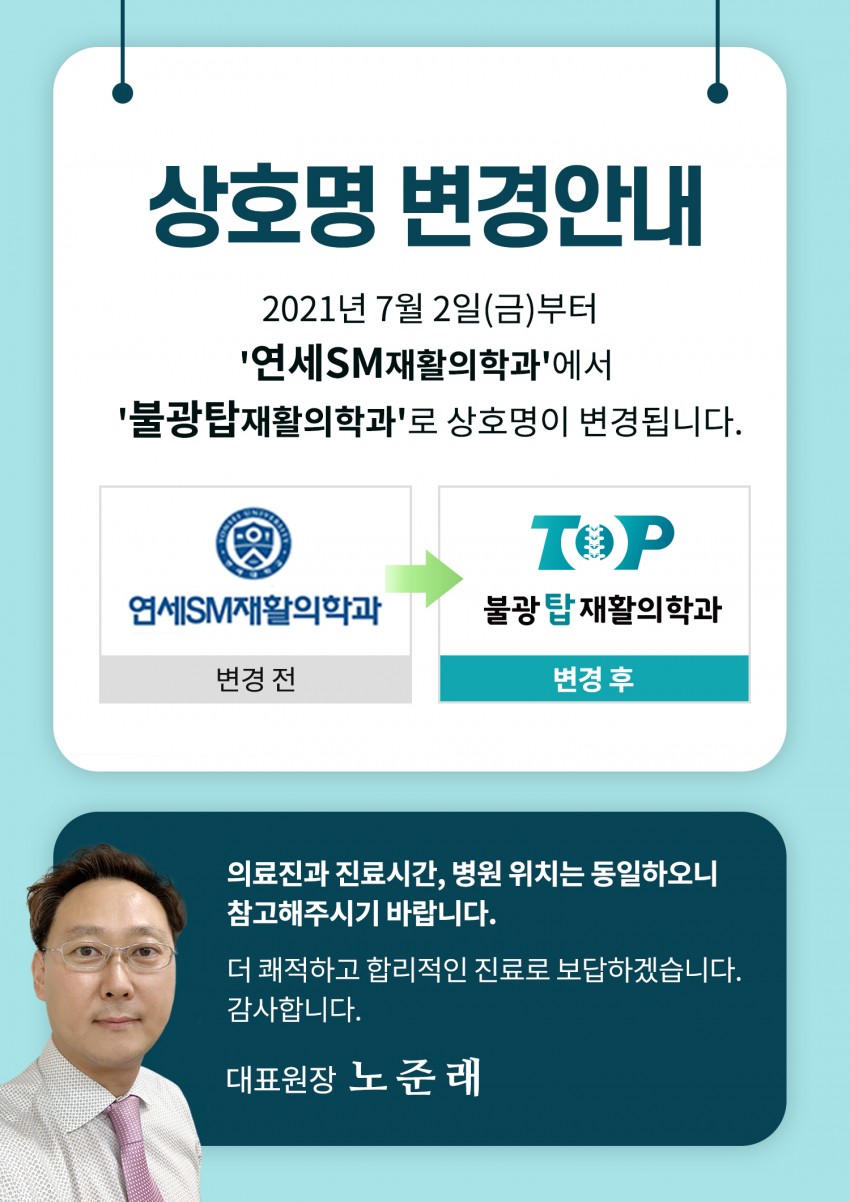 상호명 변경 안내 ( 연세SM 재활의학과 ▶ 불광탑 재활의학과 ) 페이지 정보 작성자 연세SM 작성일 21-07-02 17:07 조회7,321회 댓글0건 관련링크 이전글 다음글 목록 본문 .